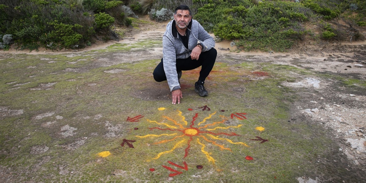 Contributing artist, Lionel Lauch of Living Culture explains the meaning behind his work Grandfather Sun installed in a Mornington site. “It is about healing and positive energy from the rays touching us like a hug…. My earth paintings educate people about Aboriginal culture and invite people to open their eyes and see what culture is there, all around us.”